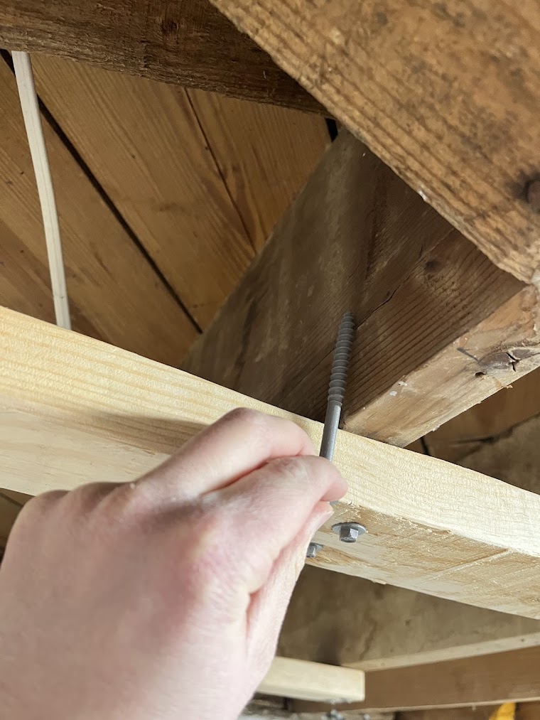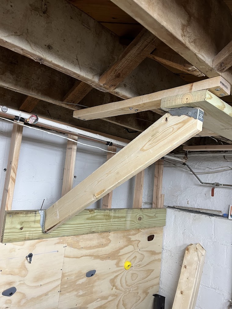 The wall is for me too! I wanted it to be something we could play on together, so I built an overhanging section for me. This is the traditional design for home climbing walls - when you don't have a lot of space, you compensate by building the wall on an angle to increase the difficulty. But constructing an overhanging wall is far trickier. I found a fantastic guide from Metolius Climbing: How to Build A Home Climbing Wall, which includes detailed descriptions of how to construct the overhanging wall safely, and which hardware to use. The best way to think of it is like a deck - instead of studs, you use beefy 2x8's with joist hangers on each end. I make sure the headers on each end were super strong (2x8's secured to the studs and to sleepers that spanned three ceiling joists each on the top). Every time I added a new part, I spent time hanging and bouncing on it, so I'm very confident that the final product is more than strong enough.