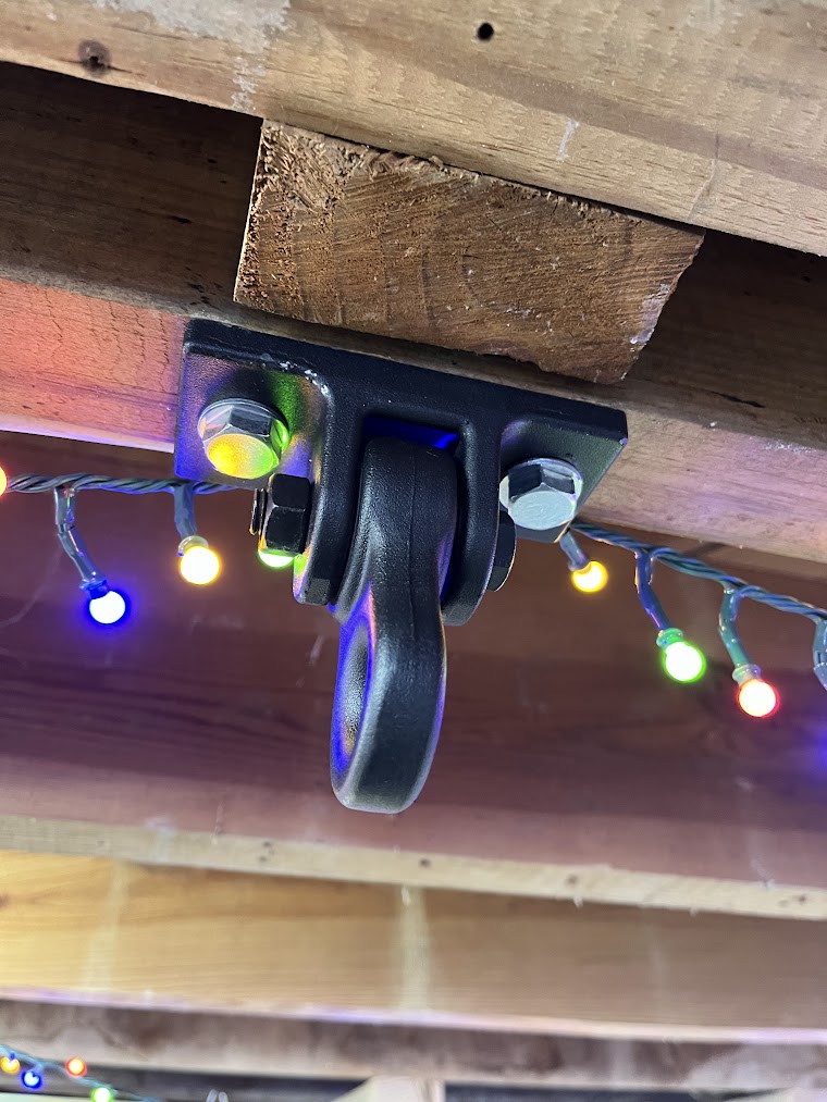 The final climbing wall is pretty compact, and I want the rest of the space to be flexible. I installed some porch swing hangers in the ceiling (secured with some huge lag bolts) - they are barely noticeable when we aren't using them, but make great attachment points when we want to relax in a hammock, or swing on gymnastics rings. We also tucked a projector up between the ceiling joists. When we took down our christmas tree in January, we put the christmas lights up on the ceiling. The result is a space where we can: